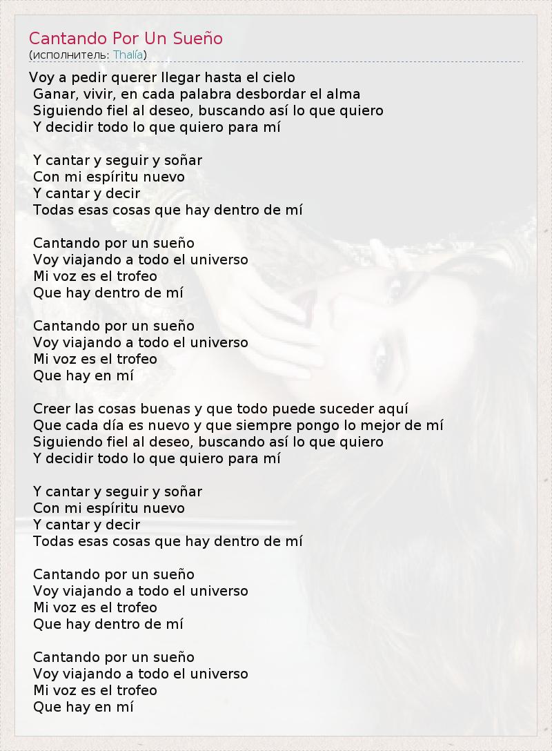 Voy a pedir querer llegar hasta el cielo Ganar, vivir, en cada palabra desbordar el alma Siguiendo fiel al deseo, buscando así lo que quiero Y decidir todo lo que quiero para mí Y cantar y seguir y soñar Con mi espíritu nuevo Y cantar y decir Todas esas cosas que hay dentro de mí Cantando por un sueño Voy viajando a todo el universo Mi voz es el trofeo Que hay dentro de mí Cantando por un sueño Voy viajando a todo el universo Mi voz es el trofeo Que hay en mí Creer las cosas buenas y que todo puede suceder aquí Que cada día es nuevo y que siempre pongo lo mejor de mí Siguiendo fiel al deseo, buscando así lo que quiero Y decidir todo lo que quiero para mí Y cantar y seguir y soñar Con mi espíritu nuevo Y cantar y decir Todas esas cosas que hay dentro de mí Cantando por un sueño Voy viajando a todo el universo Mi voz es el trofeo Que hay dentro de mí Cantando por un sueño Voy viajando a todo el universo Mi voz es el trofeo Que hay en mí