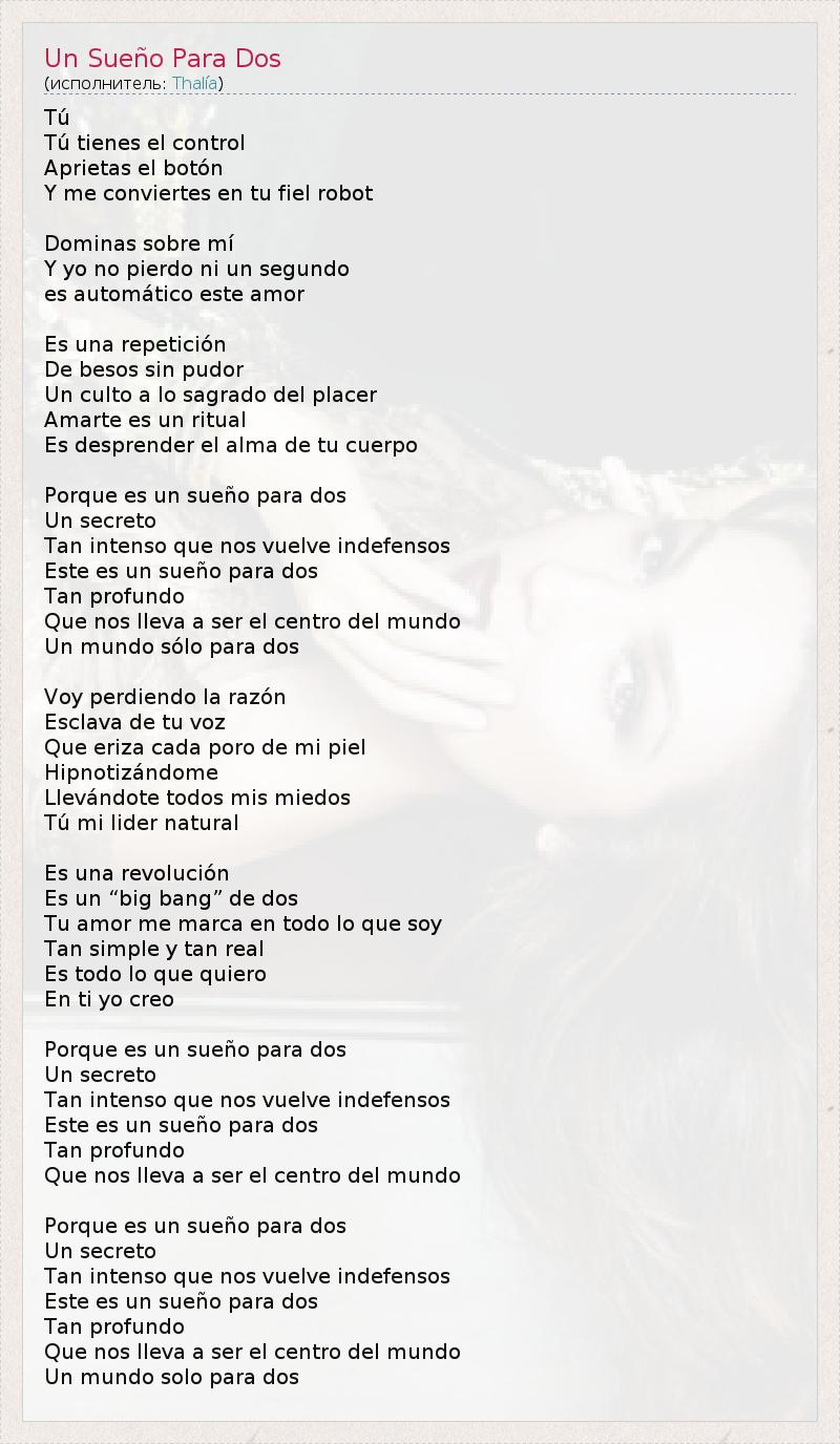 Tú Tú tienes el control Aprietas el botón Y me conviertes en tu fiel robot Dominas sobre mí Y yo no pierdo ni un segundo es automático este amor Es una repetición De besos sin pudor Un culto a lo sagrado del placer Amarte es un ritual Es desprender el alma de tu cuerpo Porque es un sueño para dos Un secreto Tan intenso que nos vuelve indefensos Este es un sueño para dos Tan profundo Que nos lleva a ser el centro del mundo Un mundo sólo para dos Voy perdiendo la razón Esclava de tu voz Que eriza cada poro de mi piel Hipnotizándome Llevándote todos mis miedos Tú mi lider natural Es una revolución Es un “big bang” de dos Tu amor me marca en todo lo que soy Tan simple y tan real Es todo lo que quiero En ti yo creo Porque es un sueño para dos Un secreto Tan intenso que nos vuelve indefensos Este es un sueño para dos Tan profundo Que nos lleva a ser el centro del mundo Porque es un sueño para dos Un secreto Tan intenso que nos vuelve indefensos Este es un sueño para dos Tan profundo Que nos lleva a ser el centro del mundo Un mundo solo para dos