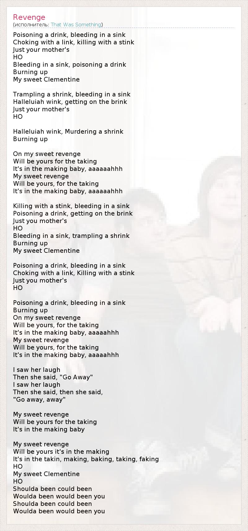 Poisoning a drink, bleeding in a sink Choking with a link, killing with a stink Just your mother's HO Bleeding in a sink, poisoning a drink Burning up My sweet Clementine Trampling a shrink, bleeding in a sink Halleluiah wink, getting on the brink Just your mother's HO Halleluiah wink, Murdering a shrink Burning up On my sweet revenge Will be yours for the taking It's in the making baby, aaaaaahhh My sweet revenge Will be yours, for the taking It's in the making baby, aaaaaahhh Killing with a stink, bleeding in a sink Poisoning a drink, getting on the brink Just you mother's HO Bleeding in a sink, trampling a shrink Burning up My sweet Clementine Poisoning a drink, bleeding in a sink Choking with a link, Killing with a stink Just you mother's HO Poisoning a drink, bleeding in a sink Burning up On my sweet revenge Will be yours, for the taking It's in the making baby, aaaaahhh My sweet revenge Will be yours, for the taking It's in the making baby, aaaaahhh I saw her laugh Then she said, "Go Away" I saw her laugh Then she said, then she said, "Go away, away" My sweet revenge Will be yours for the taking It's in the making baby My sweet revenge Will be yours it's in the making It's in the takin, making, baking, taking, faking HO My sweet Clementine HO Shoulda been could been Woulda been would been you Shoulda been could been Woulda been would been you
