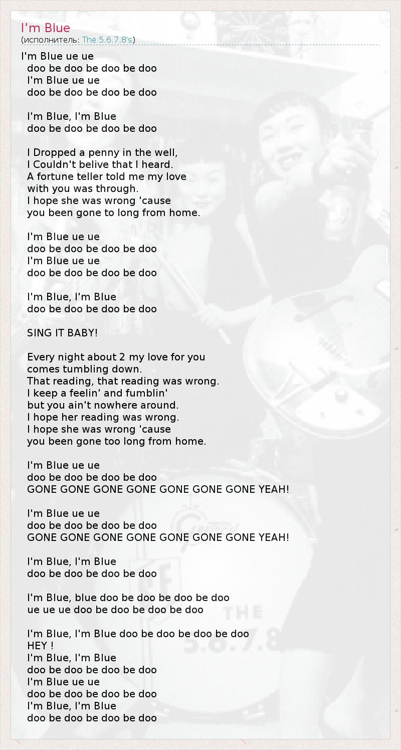 I'm Blue ue ue doo be doo be doo be doo I'm Blue ue ue doo be doo be doo be doo I'm Blue, I'm Blue doo be doo be doo be doo I Dropped a penny in the well, I Couldn't belive that I heard. A fortune teller told me my love with you was through. I hope she was wrong 'cause you been gone to long from home. I'm Blue ue ue doo be doo be doo be doo I'm Blue ue ue doo be doo be doo be doo I'm Blue, I'm Blue doo be doo be doo be doo SING IT BABY! Every night about 2 my love for you comes tumbling down. That reading, that reading was wrong. I keep a feelin' and fumblin' but you ain't nowhere around. I hope her reading was wrong. I hope she was wrong 'cause you been gone too long from home. I'm Blue ue ue doo be doo be doo be doo GONE GONE GONE GONE GONE GONE GONE YEAH! I'm Blue ue ue doo be doo be doo be doo GONE GONE GONE GONE GONE GONE GONE YEAH! I'm Blue, I'm Blue doo be doo be doo be doo I'm Blue, blue doo be doo be doo be doo ue ue ue doo be doo be doo be doo I'm Blue, I'm Blue doo be doo be doo be doo HEY ! I'm Blue, I'm Blue doo be doo be doo be doo I'm Blue ue ue doo be doo be doo be doo I'm Blue, I'm Blue doo be doo be doo be doo