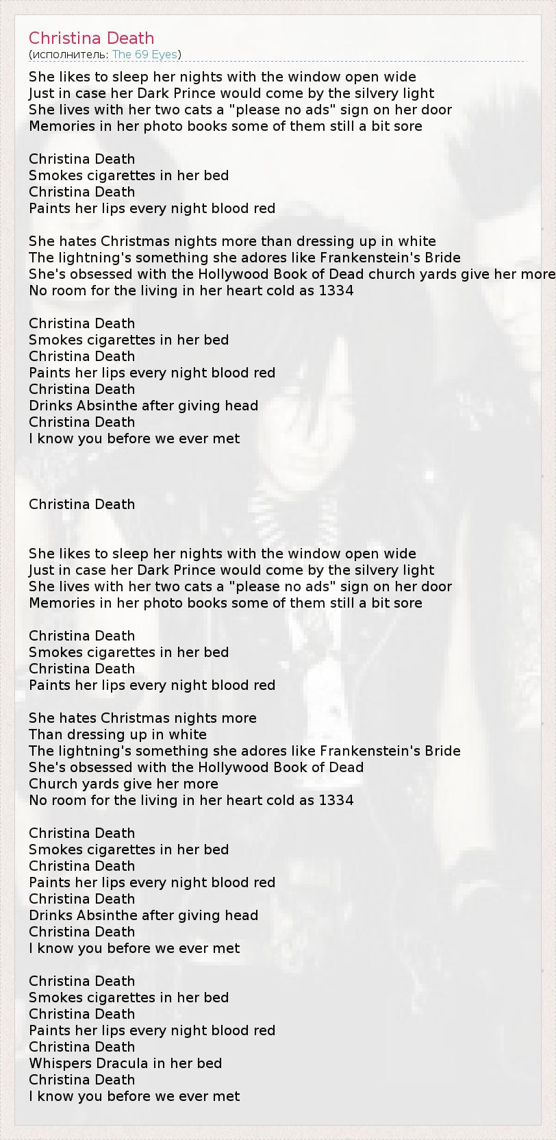 Она любит спать с настежь открытыми окнами - Вдруг ее Принц Ночи появится в лунную ночь!.. У нее есть две кошки и надпись на двери: "Не беспокоить", Воспоминания в ее альбомах все еще ранят... Кристина Death, Курит, лежа в кровати. Кристина Death Каждую ночь красит губы в алый цвет... Она ненавидит Рождественскую ночь больше, чем одеваться в белое, Она обожает молнию, подобно невесте Франкенштейна. Она зачитывается книгами мертвых, а кладбища дают ей силы. В её сердце, холодном, как в чумном 1334 г., больше ничто не живёт... Кристина Death, Курит, лежа в кровати. Кристина Death Каждую ночь красит губы в алый цвет... Кристина Death, Пьёт абсент после минета... Кристина Death, Я знал тебя до нашей встречи.... Кристина "Смерть" (перевод Ольга) На ночь она оставляет окно распахнутым - А вдруг её черный принц придёт серебристым сиянием, C ней живут её кошки, а на двери послание "Обойдёмся без рекламы", Воспоминания в её фотоальбомах всё еще немного ранят. Кристина "Смерть" Курит сигареты, лёжа в постели, Кристина "Смерть" Каждую ночь красит губы кроваво-красным… Рождественская суета выводит её из себя даже сильнее, Чем белые одежды, Она, словно Невеста Франкенштейна, поклоняется молнии, Книги мёртвых завораживают её подобно сказкам, Церковные дворы вдохновляют её как ничто другое, Сердце её, пожалуй, холоднее, чем поганый 1334*. Кристина "Смерть" Курит сигареты, лёжа в постели, Кристина "Смерть" Каждую ночь красит губы кроваво-красным, Кристина "Смерть" Запивает минет абсентом, Кристина "Смерть", Я знал тебя еще до встречи. Кристина "Смерть" Курит сигареты, лёжа в постели, Кристина "Смерть" Каждую ночь красит губы кроваво-красным Кристина "Смерть" Шепчет Дракула в её постели, Кристина "Смерть", Я знал тебя еще до встречи. * - 1334 - на папский престол взошел Бенедикт XII. В. Гюго в "Соборе Парижской Богоматери" ясно описывает разгул и порочность, царившие внутри церкви во времена его правления. Бенедикт упоминался в творчестве The 69 eyes в песне "Sister of charity"