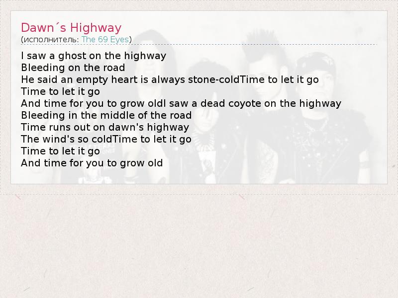 I saw a ghost on the highway Bleeding on the road He said an empty heart is always stone-coldTime to let it go Time to let it go And time for you to grow oldI saw a dead coyote on the highway Bleeding in the middle of the road Time runs out on dawn's highway The wind's so coldTime to let it go Time to let it go And time for you to grow old