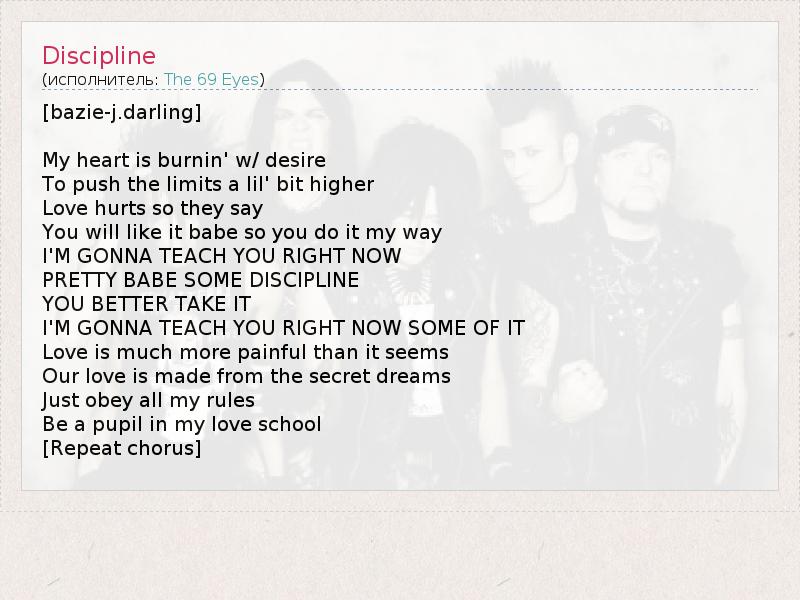 Это интересно:The 69 Eyes — финская англоязычная рок-группа. В 1990 году в Хельсинки гитарист Бази и начинающий певец Юрки69 решают организовать свою группу. До сих пор Юрки сочиняет слова для песен, а Бази - музыку. Впоследствии к ним присоединились Тимо-Тимо (ритм-гитарист), Арчи... продолжение