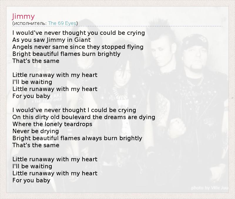 I would've never thought you could be crying As you saw Jimmy in Giant Angels never same since they stopped flying Bright beautiful flames burn brightly That's the same Little runaway with my heart I'll be waiting Little runaway with my heart For you baby I would've never thought I could be crying On this dirty old boulevard the dreams are dying Where the lonely teardrops Never be drying Bright beautiful flames always burn brightly That's the same Little runaway with my heart I'll be waiting Little runaway with my heart For you baby