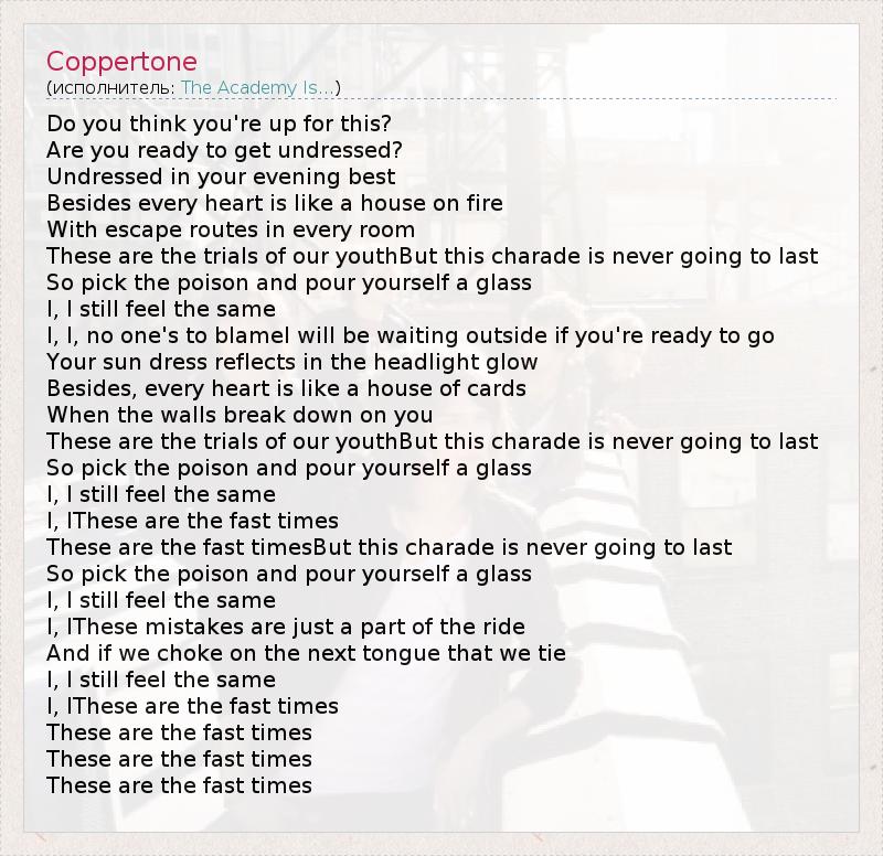 Do you think you're up for this? Are you ready to get undressed? Undressed in your evening best Besides every heart is like a house on fire With escape routes in every room These are the trials of our youthBut this charade is never going to last So pick the poison and pour yourself a glass I, I still feel the same I, I, no one's to blameI will be waiting outside if you're ready to go Your sun dress reflects in the headlight glow Besides, every heart is like a house of cards When the walls break down on you These are the trials of our youthBut this charade is never going to last So pick the poison and pour yourself a glass I, I still feel the same I, IThese are the fast times These are the fast timesBut this charade is never going to last So pick the poison and pour yourself a glass I, I still feel the same I, IThese mistakes are just a part of the ride And if we choke on the next tongue that we tie I, I still feel the same I, IThese are the fast times These are the fast times These are the fast times These are the fast times