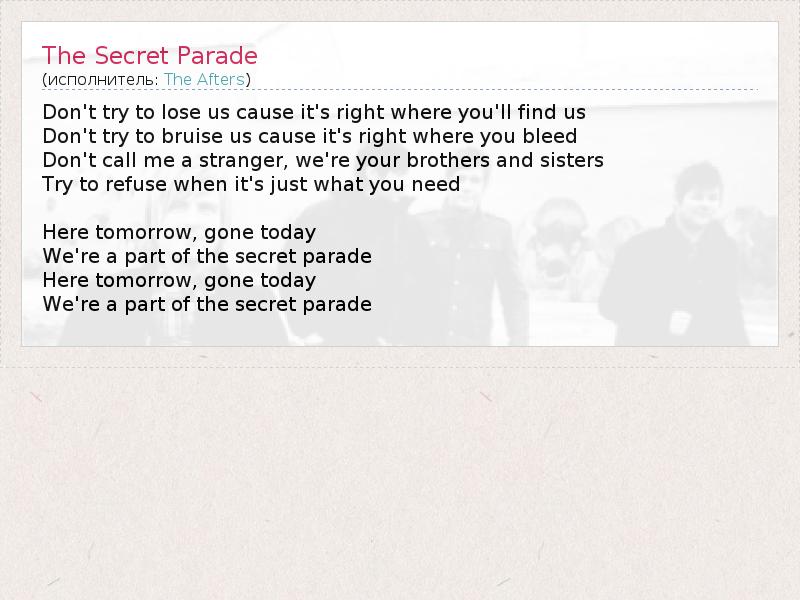 А как ты думаешь, о чем песня "The Secret Parade" ?