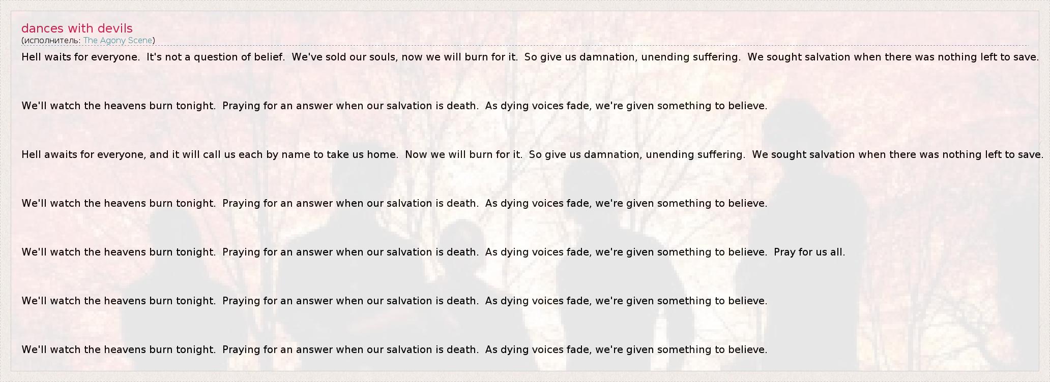 Hell awaits for everyone, and it will call us each by name to take us home.  Now we will burn for it.  So give us damnation, unending suffering.  We sought salvation when there was nothing left to save.