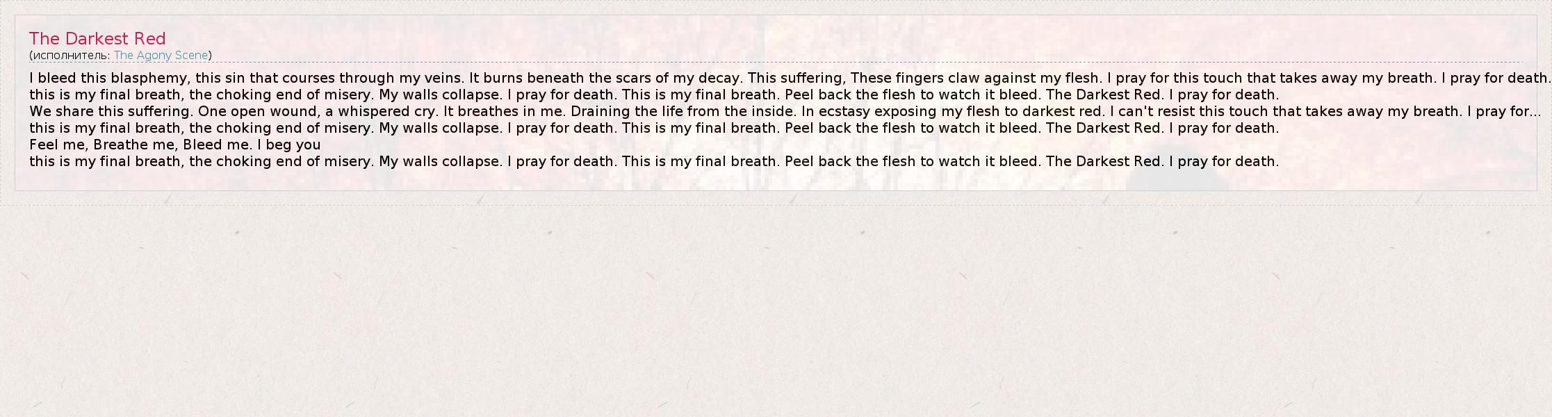 I bleed this blasphemy, this sin that courses through my veins. It burns beneath the scars of my decay. This suffering, These fingers claw against my flesh. I pray for this touch that takes away my breath. I pray for death. this is my final breath, the choking end of misery. My walls collapse. I pray for death. This is my final breath. Peel back the flesh to watch it bleed. The Darkest Red. I pray for death. We share this suffering. One open wound, a whispered cry. It breathes in me. Draining the life from the inside. In ecstasy exposing my flesh to darkest red. I can't resist this touch that takes away my breath. I pray for... this is my final breath, the choking end of misery. My walls collapse. I pray for death. This is my final breath. Peel back the flesh to watch it bleed. The Darkest Red. I pray for death. Feel me, Breathe me, Bleed me. I beg you this is my final breath, the choking end of misery. My walls collapse. I pray for death. This is my final breath. Peel back the flesh to watch it bleed. The Darkest Red. I pray for death.