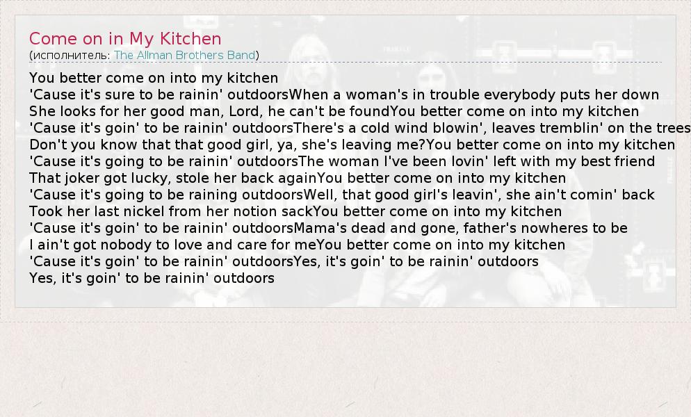 А как ты думаешь, о чем песня "Come on in My Kitchen" ?