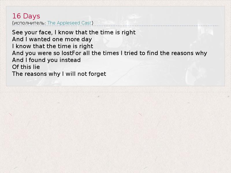 Это интересно:The Appleseed Cast - группа из города Лоуренс, штат Канзас, играющая смесь из indie / emo / post-rock / alternative rock.“Основание и дебют (1997 - 1998)”Инди группа The Appleseed Cast была образована в 1997 году в Южной Калифорнии музыкантами: Christopher Crisci, Jason Wickersheim и Louie Ruiz и изначально называлась December's Tragic Drive (название коллектива - фраза, взятая из песни “Seven"... продолжение