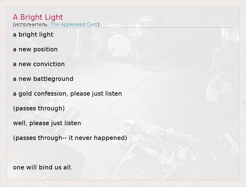 Это интересно:The Appleseed Cast - группа из города Лоуренс, штат Канзас, играющая смесь из indie / emo / post-rock / alternative rock.“Основание и дебют (1997 - 1998)”Инди группа The Appleseed Cast была образована в 1997 году в Южной Калифорнии музыкантами: Christopher Crisci, Jason Wickersheim и Louie Ruiz и изначально называлась December's Tragic Drive (название коллектива - фраза, взятая из песни “Seven"... продолжение
