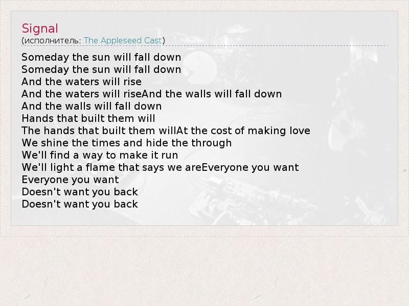Это интересно:The Appleseed Cast - группа из города Лоуренс, штат Канзас, играющая смесь из indie / emo / post-rock / alternative rock.“Основание и дебют (1997 - 1998)”Инди группа The Appleseed Cast была образована в 1997 году в Южной Калифорнии музыкантами: Christopher Crisci, Jason Wickersheim и Louie Ruiz и изначально называлась December's Tragic Drive (название коллектива - фраза, взятая из песни “Seven"... продолжение
