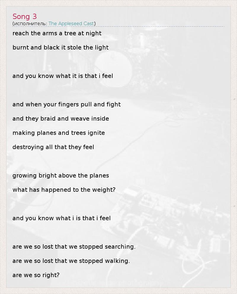 Это интересно:The Appleseed Cast - группа из города Лоуренс, штат Канзас, играющая смесь из indie / emo / post-rock / alternative rock.“Основание и дебют (1997 - 1998)”Инди группа The Appleseed Cast была образована в 1997 году в Южной Калифорнии музыкантами: Christopher Crisci, Jason Wickersheim и Louie Ruiz и изначально называлась December's Tragic Drive (название коллектива - фраза, взятая из песни “Seven"... продолжение