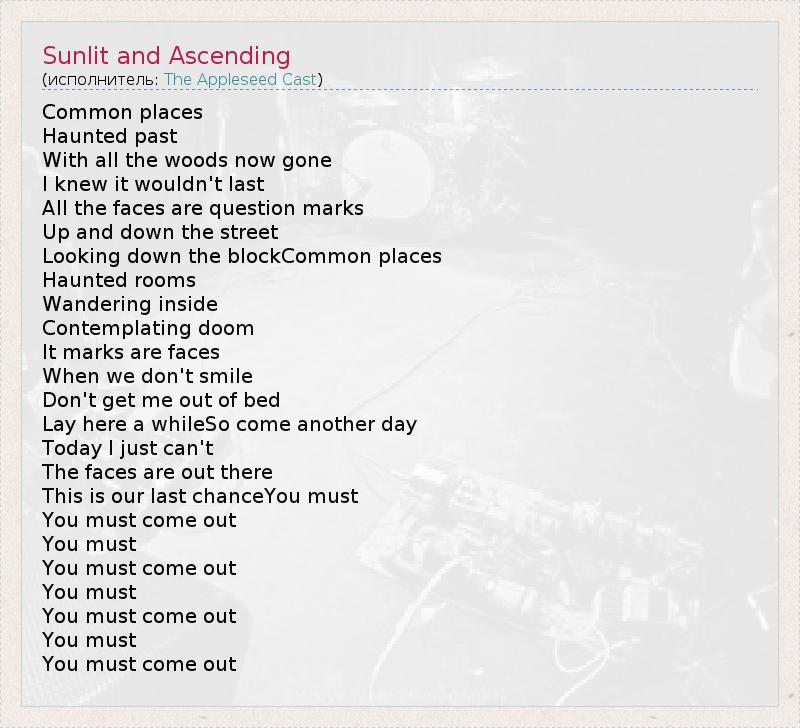 Это интересно:The Appleseed Cast - группа из города Лоуренс, штат Канзас, играющая смесь из indie / emo / post-rock / alternative rock.“Основание и дебют (1997 - 1998)”Инди группа The Appleseed Cast была образована в 1997 году в Южной Калифорнии музыкантами: Christopher Crisci, Jason Wickersheim и Louie Ruiz и изначально называлась December's Tragic Drive (название коллектива - фраза, взятая из песни “Seven"... продолжение