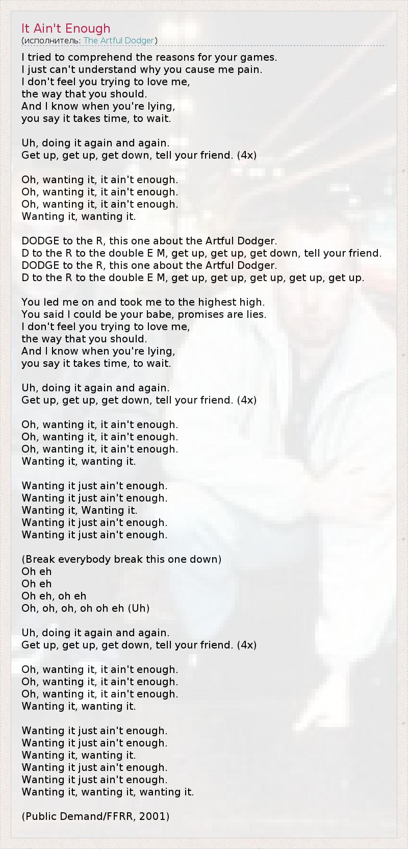 I tried to comprehend the reasons for your games. I just can't understand why you cause me pain. I don't feel you trying to love me, the way that you should. And I know when you're lying, you say it takes time, to wait. Uh, doing it again and again. Get up, get up, get down, tell your friend. (4x) Oh, wanting it, it ain't enough. Oh, wanting it, it ain't enough. Oh, wanting it, it ain't enough. Wanting it, wanting it. DODGE to the R, this one about the Artful Dodger. D to the R to the double E M, get up, get up, get down, tell your friend. DODGE to the R, this one about the Artful Dodger. D to the R to the double E M, get up, get up, get up, get up, get up. You led me on and took me to the highest high. You said I could be your babe, promises are lies. I don't feel you trying to love me, the way that you should. And I know when you're lying, you say it takes time, to wait. Uh, doing it again and again. Get up, get up, get down, tell your friend. (4x) Oh, wanting it, it ain't enough. Oh, wanting it, it ain't enough. Oh, wanting it, it ain't enough. Wanting it, wanting it. Wanting it just ain't enough. Wanting it just ain't enough. Wanting it, Wanting it. Wanting it just ain't enough. Wanting it just ain't enough. (Break everybody break this one down) Oh eh Oh eh Oh eh, oh eh Oh, oh, oh, oh oh eh (Uh) Uh, doing it again and again. Get up, get up, get down, tell your friend. (4x) Oh, wanting it, it ain't enough. Oh, wanting it, it ain't enough. Oh, wanting it, it ain't enough. Wanting it, wanting it. Wanting it just ain't enough. Wanting it just ain't enough. Wanting it, wanting it. Wanting it just ain't enough. Wanting it just ain't enough. Wanting it, wanting it, wanting it. (Public Demand/FFRR, 2001)