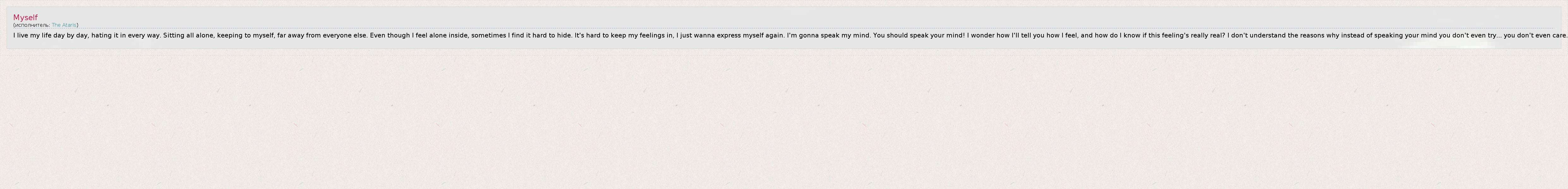 I live my life day by day, hating it in every way. Sitting all alone, keeping to myself, far away from everyone else. Even though I feel alone inside, sometimes I find it hard to hide. It's hard to keep my feelings in, I just wanna express myself again. I'm gonna speak my mind. You should speak your mind! I wonder how I'll tell you how I feel, and how do I know if this feeling's really real? I don't understand the reasons why instead of speaking your mind you don't even try... you don't even care.