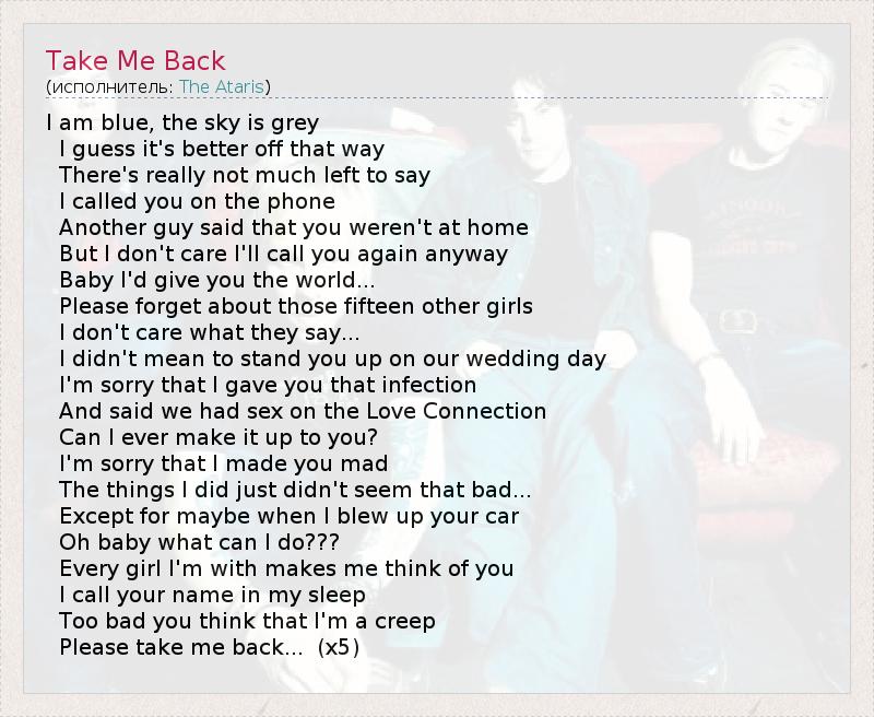 А как ты думаешь, о чем песня "Take Me Back" ?