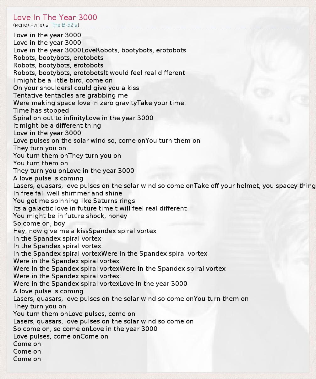 Love in the year 3000 Love in the year 3000 Love in the year 3000LoveRobots, bootybots, erotobots Robots, bootybots, erotobots Robots, bootybots, erotobots Robots, bootybots, erotobotsIt would feel real different I might be a little bird, come on On your shouldersI could give you a kiss Tentative tentacles are grabbing me Were making space love in zero gravityTake your time Time has stopped Spiral on out to infinityLove in the year 3000 It might be a different thing Love in the year 3000 Love pulses on the solar wind so, come onYou turn them on They turn you on You turn them onThey turn you on You turn them on They turn you onLove in the year 3000 A love pulse is coming Lasers, quasars, love pulses on the solar wind so come onTake off your helmet, you spacey thing In free fall well shimmer and shine You got me spinning like Saturns rings Its a galactic love in future timeIt will feel real different You might be in future shock, honey So come on, boy Hey, now give me a kissSpandex spiral vortex In the Spandex spiral vortex In the Spandex spiral vortex In the Spandex spiral vortexWere in the Spandex spiral vortex Were in the Spandex spiral vortex Were in the Spandex spiral vortexWere in the Spandex spiral vortex Were in the Spandex spiral vortex Were in the Spandex spiral vortexLove in the year 3000 A love pulse is coming Lasers, quasars, love pulses on the solar wind so come onYou turn them on They turn you on You turn them onLove pulses, come on Lasers, quasars, love pulses on the solar wind so come on So come on, so come onLove in the year 3000 Love pulses, come onCome on Come on Come on Come on
