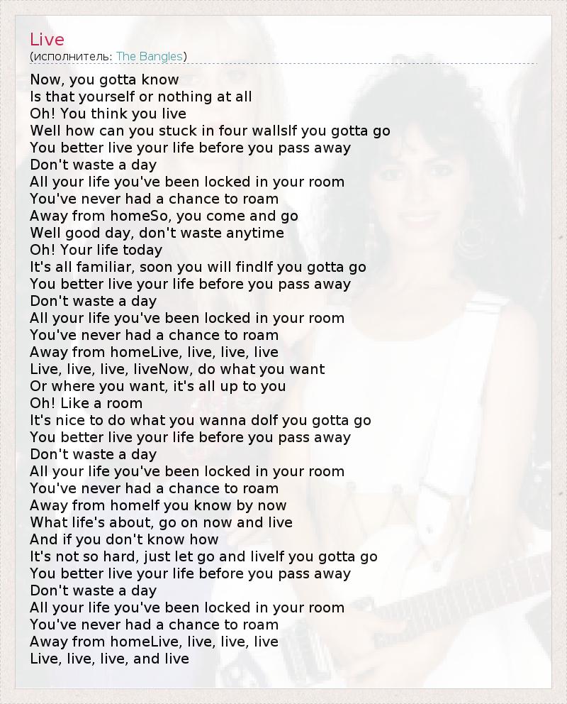 Now, you gotta know Is that yourself or nothing at all Oh! You think you live Well how can you stuck in four wallsIf you gotta go You better live your life before you pass away Don't waste a day All your life you've been locked in your room You've never had a chance to roam Away from homeSo, you come and go Well good day, don't waste anytime Oh! Your life today It's all familiar, soon you will findIf you gotta go You better live your life before you pass away Don't waste a day All your life you've been locked in your room You've never had a chance to roam Away from homeLive, live, live, live Live, live, live, liveNow, do what you want Or where you want, it's all up to you Oh! Like a room It's nice to do what you wanna doIf you gotta go You better live your life before you pass away Don't waste a day All your life you've been locked in your room You've never had a chance to roam Away from homeIf you know by now What life's about, go on now and live And if you don't know how It's not so hard, just let go and liveIf you gotta go You better live your life before you pass away Don't waste a day All your life you've been locked in your room You've never had a chance to roam Away from homeLive, live, live, live Live, live, live, and live
