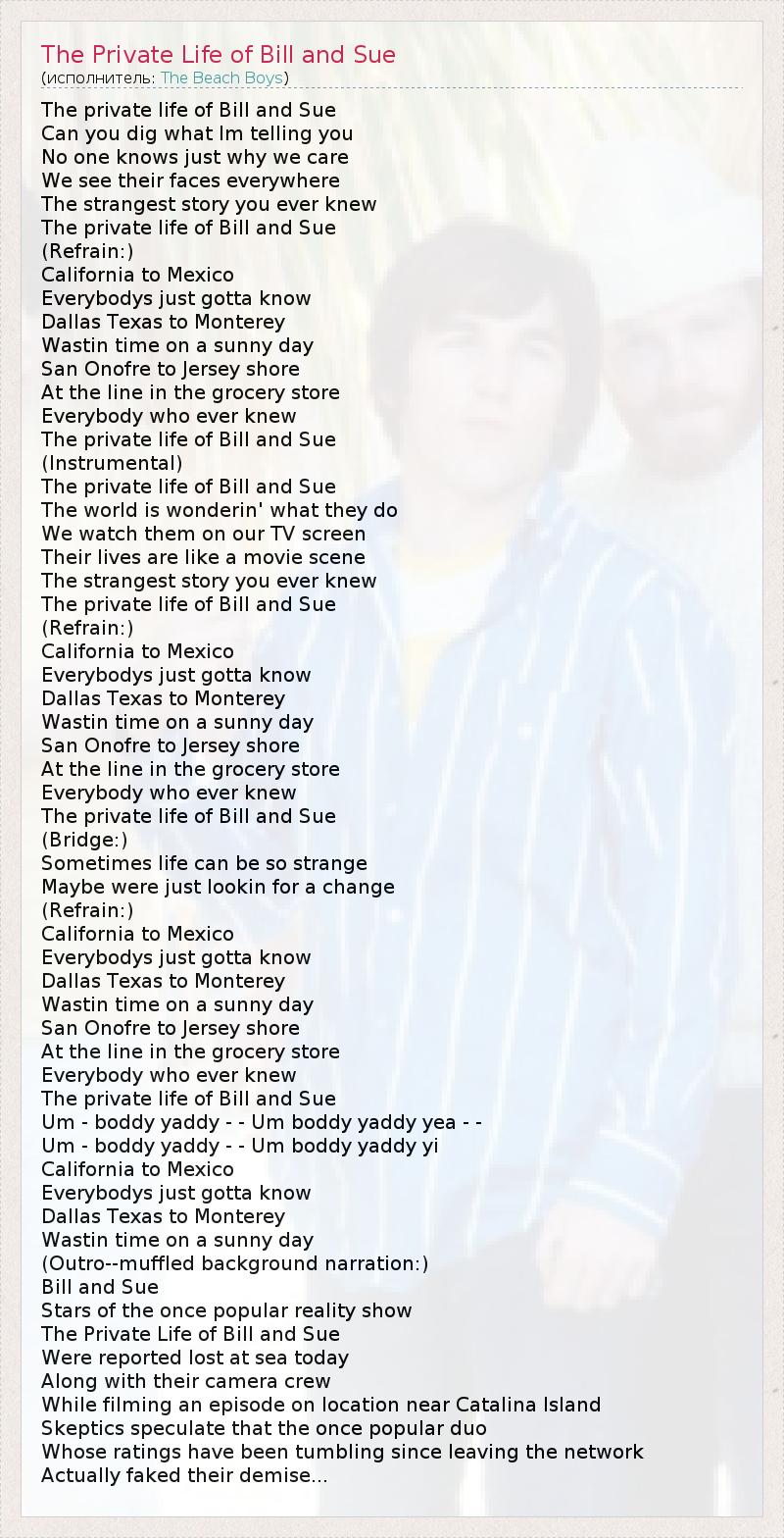 The private life of Bill and Sue Can you dig what Im telling you No one knows just why we care We see their faces everywhere The strangest story you ever knew The private life of Bill and Sue (Refrain:) California to Mexico Everybodys just gotta know Dallas Texas to Monterey Wastin time on a sunny day San Onofre to Jersey shore At the line in the grocery store Everybody who ever knew The private life of Bill and Sue (Instrumental) The private life of Bill and Sue The world is wonderin' what they do We watch them on our TV screen Their lives are like a movie scene The strangest story you ever knew The private life of Bill and Sue (Refrain:) California to Mexico Everybodys just gotta know Dallas Texas to Monterey Wastin time on a sunny day San Onofre to Jersey shore At the line in the grocery store Everybody who ever knew The private life of Bill and Sue (Bridge:) Sometimes life can be so strange Maybe were just lookin for a change (Refrain:) California to Mexico Everybodys just gotta know Dallas Texas to Monterey Wastin time on a sunny day San Onofre to Jersey shore At the line in the grocery store Everybody who ever knew The private life of Bill and Sue Um - boddy yaddy - - Um boddy yaddy yea - - Um - boddy yaddy - - Um boddy yaddy yi California to Mexico Everybodys just gotta know Dallas Texas to Monterey Wastin time on a sunny day (Outro--muffled background narration:) Bill and Sue Stars of the once popular reality show The Private Life of Bill and Sue Were reported lost at sea today Along with their camera crew While filming an episode on location near Catalina Island Skeptics speculate that the once popular duo Whose ratings have been tumbling since leaving the network Actually faked their demise...