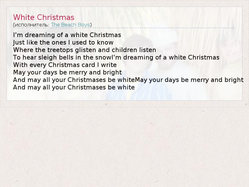 I'm dreaming of a white Christmas Just like the ones I used to know Where the treetops glisten and children listen To hear sleigh bells in the snowI'm dreaming of a white Christmas With every Christmas card I write May your days be merry and bright And may all your Christmases be whiteMay your days be merry and bright And may all your Christmases be white