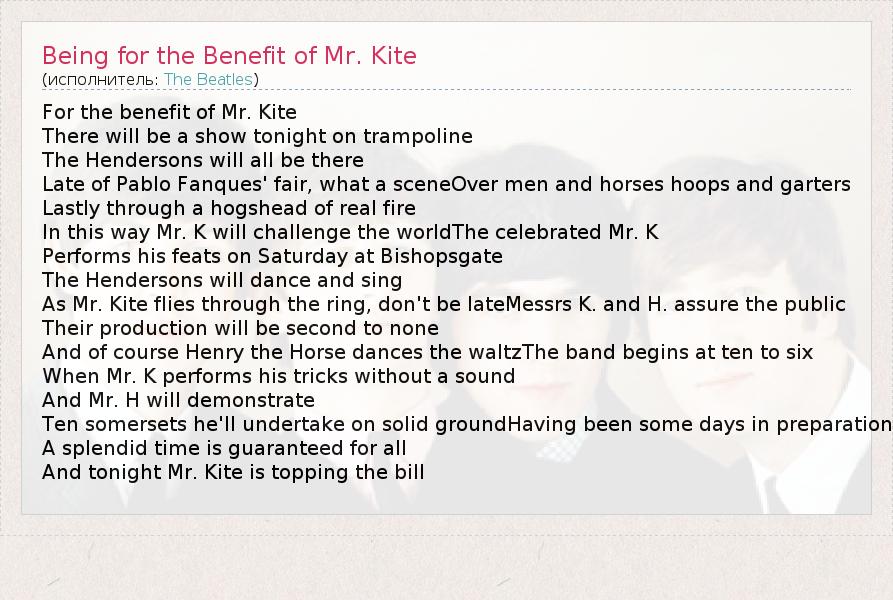 А как ты думаешь, о чем песня "Being for the Benefit of Mr. Kite" ?