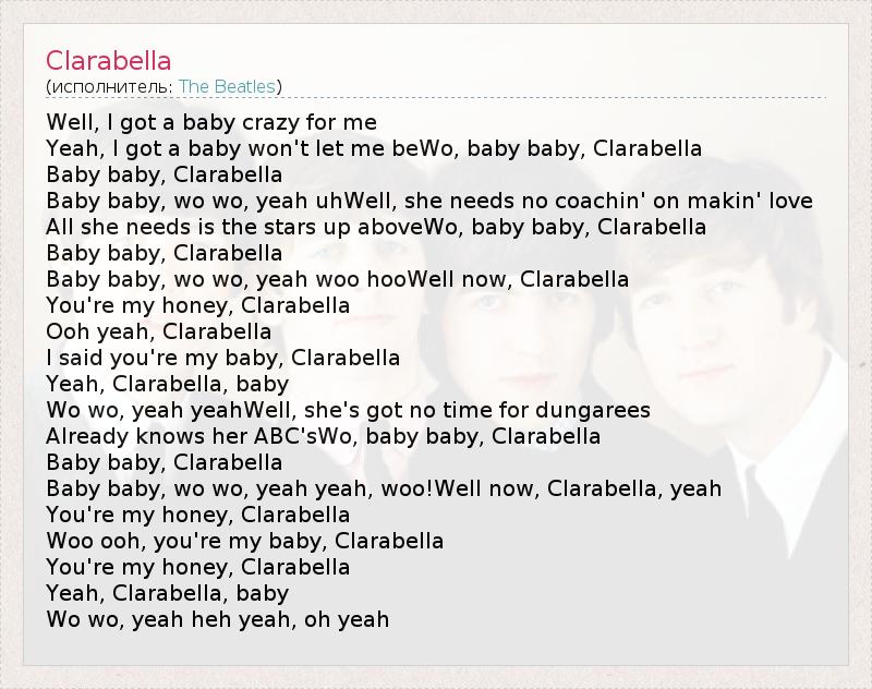 Well, I got a baby crazy for me Yeah, I got a baby won't let me beWo, baby baby, Clarabella Baby baby, Clarabella Baby baby, wo wo, yeah uhWell, she needs no coachin' on makin' love All she needs is the stars up aboveWo, baby baby, Clarabella Baby baby, Clarabella Baby baby, wo wo, yeah woo hooWell now, Clarabella You're my honey, Clarabella Ooh yeah, Clarabella I said you're my baby, Clarabella Yeah, Clarabella, baby Wo wo, yeah yeahWell, she's got no time for dungarees Already knows her ABC'sWo, baby baby, Clarabella Baby baby, Clarabella Baby baby, wo wo, yeah yeah, woo!Well now, Clarabella, yeah You're my honey, Clarabella Woo ooh, you're my baby, Clarabella You're my honey, Clarabella Yeah, Clarabella, baby Wo wo, yeah heh yeah, oh yeah