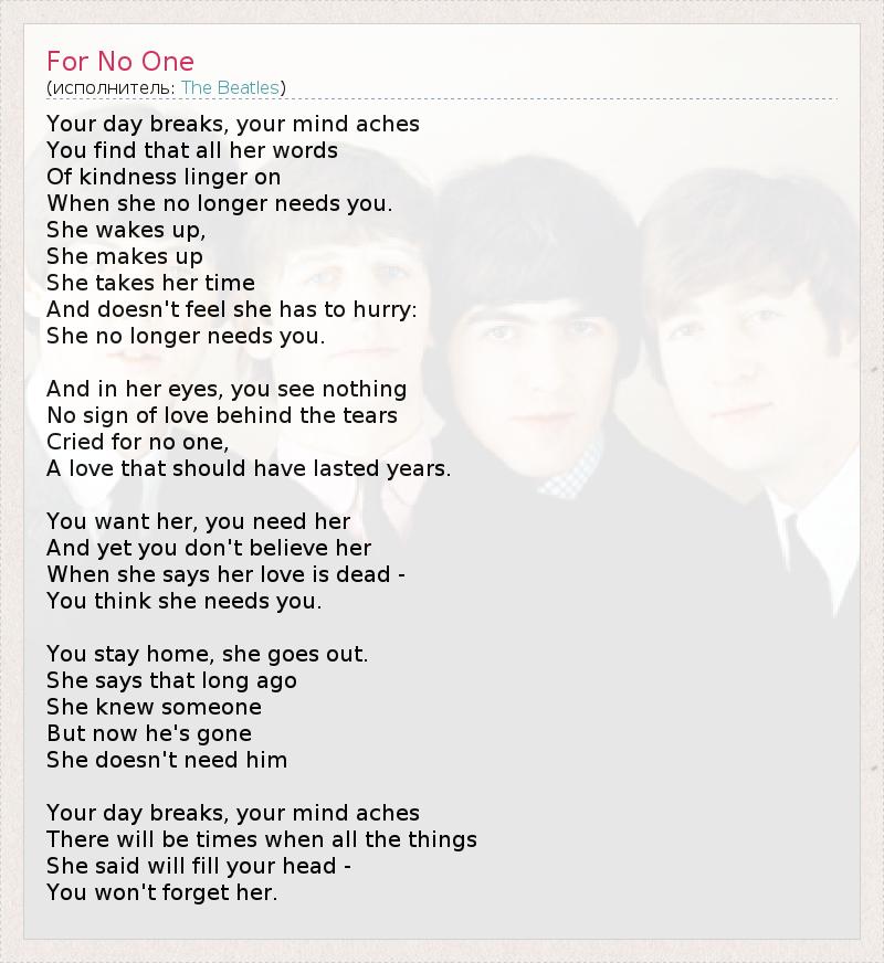«For No One» (в переводе с англ. Ни для кого) — песня дуэта Леннон/Маккартни, записанная 9, 16, 19 мая 1966 года. Пол Маккартни рассказывает, что сочинил её во время своего отпуска в Швейцарии, который он проводил вместе с Джейн Эшер. Первоначальное название было «Why Did It Die?». В записи кроме самого Пола участвовал лишь Ринго, исполнив партию ударных. Специально для записи был приглашён Алан Сивил из Лондонской филармонии. Он сыграл на валторне по нотам, написанным Джорджем Мартином.
