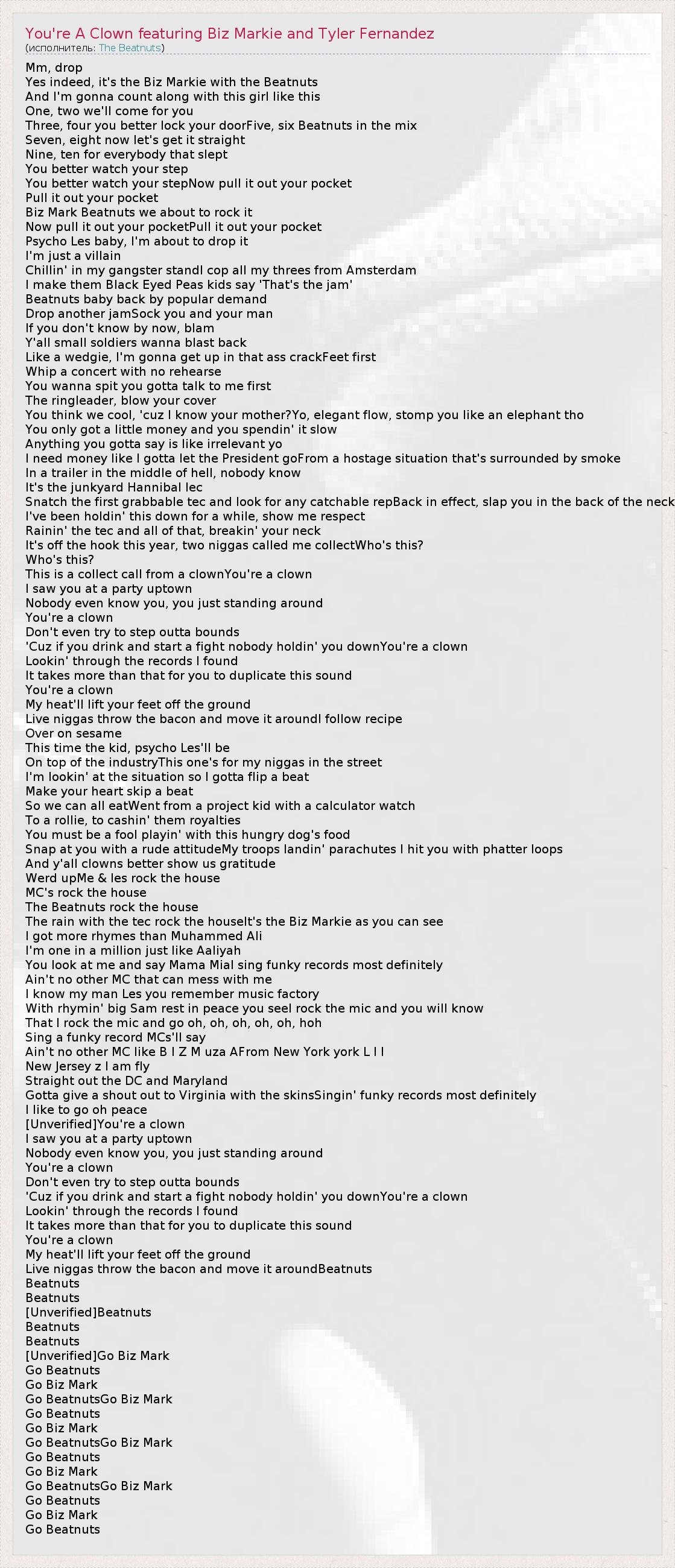 ГлавнаяИсполнителиThe BeatnutsYou're A Clown featuring Biz Markie and Tyler Fernandez