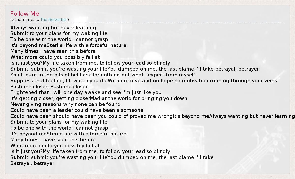 Always wanting but never learning Submit to your plans for my waking life To be one with the world I cannot grasp It's beyond meSterile life with a forceful nature Many times I have seen this before What more could you possibly fail at Is it just you?My life taken from me, to follow your lead so blindly Submit, submit you're wasting your lifeYou dumped on me, the last blame I'll take betrayal, betrayer You'll burn in the pits of hellI ask for nothing but what I expect from myself Suppress that feeling, I'll watch you dieWith no drive and no hope no motivation running through your veins Push me closer, Push me closer Frightened that I will one day awake and see I'm just like you It's getting closer, getting closerMad at the world for bringing you down Never giving reasons why none can be found Could have been a leader could have been a someone Could have been should have been you could of proved me wrongIt's beyond meAlways wanting but never learning Submit to your plans for my waking life To be one with the world I cannot grasp It's beyond meSterile life with a forceful nature Many times I have seen this before What more could you possibly fail at Is it just you?My life taken from me, to follow your lead so blindly Submit, submit you're wasting your lifeYou dumped on me, the last blame I'll take Betrayal, betrayer