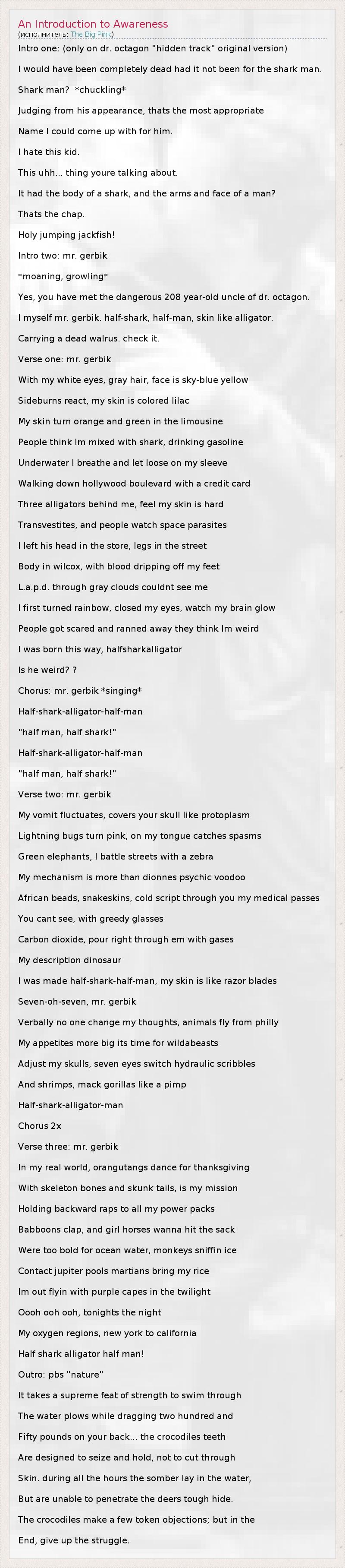 Intro one: (only on dr. octagon "hidden track" original version) I would have been completely dead had it not been for the shark man. Shark man? *chuckling* Judging from his appearance, thats the most appropriate Name I could come up with for him. I hate this kid. This uhh... thing youre talking about. It had the body of a shark, and the arms and face of a man? Thats the chap. Holy jumping jackfish! Intro two: mr. gerbik *moaning, growling* Yes, you have met the dangerous 208 year-old uncle of dr. octagon. I myself mr. gerbik. half-shark, half-man, skin like alligator. Carrying a dead walrus. check it. Verse one: mr. gerbik With my white eyes, gray hair, face is sky-blue yellow Sideburns react, my skin is colored lilac My skin turn orange and green in the limousine People think Im mixed with shark, drinking gasoline Underwater I breathe and let loose on my sleeve Walking down hollywood boulevard with a credit card Three alligators behind me, feel my skin is hard Transvestites, and people watch space parasites I left his head in the store, legs in the street Body in wilcox, with blood dripping off my feet L.a.p.d. through gray clouds couldnt see me I first turned rainbow, closed my eyes, watch my brain glow People got scared and ranned away they think Im weird I was born this way, halfsharkalligator Is he weird? ? Chorus: mr. gerbik *singing* Half-shark-alligator-half-man "half man, half shark!" Half-shark-alligator-half-man "half man, half shark!" Verse two: mr. gerbik My vomit fluctuates, covers your skull like protoplasm Lightning bugs turn pink, on my tongue catches spasms Green elephants, I battle streets with a zebra My mechanism is more than dionnes psychic voodoo African beads, snakeskins, cold script through you my medical passes You cant see, with greedy glasses Carbon dioxide, pour right through em with gases My description dinosaur I was made half-shark-half-man, my skin is like razor blades Seven-oh-seven, mr. gerbik Verbally no one change my thoughts, animals fly from philly My appetites more big its time for wildabeasts Adjust my skulls, seven eyes switch hydraulic scribbles And shrimps, mack gorillas like a pimp Half-shark-alligator-man Chorus 2x Verse three: mr. gerbik In my real world, orangutangs dance for thanksgiving With skeleton bones and skunk tails, is my mission Holding backward raps to all my power packs Babboons clap, and girl horses wanna hit the sack Were too bold for ocean water, monkeys sniffin ice Contact jupiter pools martians bring my rice Im out flyin with purple capes in the twilight Oooh ooh ooh, tonights the night My oxygen regions, new york to california Half shark alligator half man! Outro: pbs "nature" It takes a supreme feat of strength to swim through The water plows while dragging two hundred and Fifty pounds on your back... the crocodiles teeth Are designed to seize and hold, not to cut through Skin. during all the hours the somber lay in the water, But are unable to penetrate the deers tough hide. The crocodiles make a few token objections; but in the End, give up the struggle.