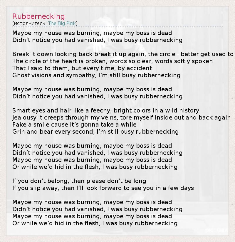 Maybe my house was burning, maybe my boss is dead Didn’t notice you had vanished, I was busy rubbernecking Break it down looking back break it up again, the circle I better get used to The circle of the heart is broken, words so clear, words softly spoken That I said to them, but every time, by accident Ghost visions and sympathy, I’m still busy rubbernecking Maybe my house was burning, maybe my boss is dead Didn’t notice you had vanished, I was busy rubbernecking Smart eyes and hair like a feechy, bright colors in a wild history Jealousy it creeps through my veins, tore myself inside out and back again Fake a smile cause it’s gonna take a while Grin and bear every second, I’m still busy rubbernecking Maybe my house was burning, maybe my boss is dead Didn’t notice you had vanished, I was busy rubbernecking Maybe my house was burning, maybe my boss is dead Or while we’d hid in the flesh, I was busy rubbernecking If you don’t belong, then please don’t be long If you slip away, then I’ll look forward to see you in a few days Maybe my house was burning, maybe my boss is dead Didn’t notice you had vanished, I was busy rubbernecking Maybe my house was burning, maybe my boss is dead Or while we’d hid in the flesh, I was busy rubbernecking