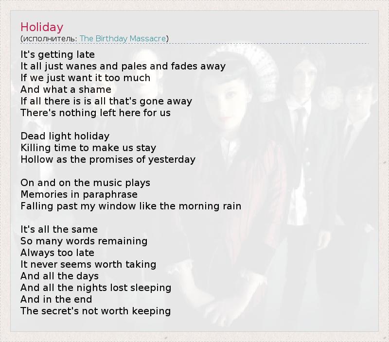 Становится поздно. Все просто убывает, бледнеет и исчезает, Если мы хотим этого слишком сильно. И как же жаль, Если все, что есть, уходит. Для нас здесь больше ничего не осталось. Праздник мертвого света, Убивающий время, чтобы заставить нас остаться, Пустой, как вчерашние обещания. Музыка все играет и играет, Пересказанные воспоминания, Падающие перед моим окном, словно утренний дождь. Все одно и то же. Осталось так много слов. Всегда слишком поздно, Кажется, это никогда не стоит того, чтобы это иметь. И все дни, И все ночи без сна, И в конце концов Секрет не стоит того, чтобы его хранить.
