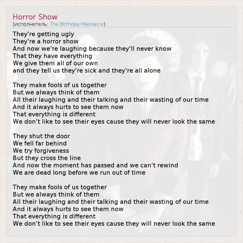 Они становятся отвратительными, Они – шоу уродов. А сейчас мы смеемся, потому что они никогда не узнают, Что у них есть все. Мы отдаем им все, что у нас есть, А они говорят нам, что им плохо и они совсем одиноки. Они из всех нас делают идиотов, Но мы всегда о них думаем. Весь их смех, и их разговоры, и наше потраченное на них время. И каждый раз больно теперь видеть их, Когда все изменилось. Нам не нравится видеть их глаза, потому что они никогда не будут выглядеть так же. Они запирают дверь. Мы остались далеко позади. Мы пытаемся быть снисходительными, Но они пересекли черту, И теперь момент упущен и мы не можем вернуться. Мы умираем задолго до того, как изнашиваемся. Они из всех нас делают идиотов, Но мы всегда о них думаем. Весь их смех, и их разговоры, и наше потраченное на них время. И каждый раз больно теперь видеть их, Когда все изменилось. Нам не нравится видеть их глаза, потому что они никогда не будут выглядеть так же.