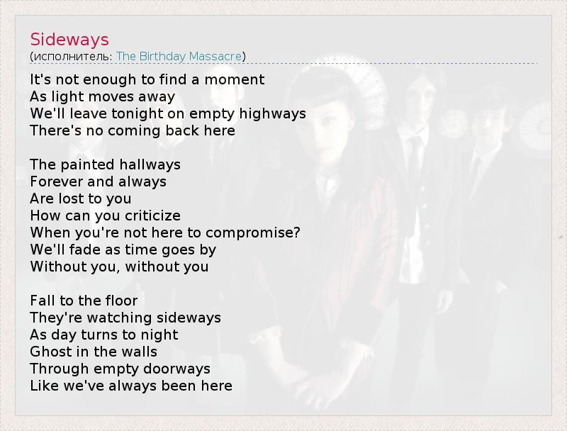 Это интересно:The Birthday Massacre — канадская рок-группа, совмещающая в своей музыке стили New Wave и Electro Rock. Изначально именовалась Imagica (Имаджика), по одноименному фэнтэзийному роману Клайва Баркера.Группа The Birthday Massacre была сформирована в 1999 году. Rainbow и Chibi повстречались, когда учились в лондонском колледже Изобразительного Искусства. Aslan также учился в колледже и был соседом по комнате... продолжение