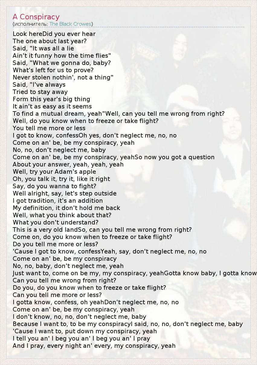 Look hereDid you ever hear The one about last year? Said, "It was all a lie Ain't it funny how the time flies" Said, "What we gonna do, baby? What's left for us to prove? Never stolen nothin', not a thing" Said, "I've always Tried to stay away Form this year's big thing It ain't as easy as it seems To find a mutual dream, yeah"Well, can you tell me wrong from right? Well, do you know when to freeze or take flight? You tell me more or less I got to know, confessOh yes, don't neglect me, no, no Come on an' be, be my conspiracy, yeah No, no, don't neglect me, baby Come on an' be, be my conspiracy, yeahSo now you got a question About your answer, yeah, yeah, yeah Well, try your Adam's apple Oh, you talk it, try it, like it right Say, do you wanna to fight? Well alright, say, let's step outside I got tradition, it's an addition My definition, it don't hold me back Well, what you think about that? What you don't understand? This is a very old landSo, can you tell me wrong from right? Come on, do you know when to freeze or take flight? Do you tell me more or less? 'Cause I got to know, confessYeah, say, don't neglect me, no, no Come on an' be, be my conspiracy No, no, baby, don't neglect me, yeah Just want to, come on be my, my conspiracy, yeahGotta know baby, I gotta know Can you tell me wrong from right? Do you, do you know when to freeze or take flight? Can you tell me more or less? I gotta know, confess, oh yeahDon't neglect me, no, no Come on an' be, be my conspiracy, yeah I don't know, no, no, don't neglect me, baby Because I want to, to be my conspiracyI said, no, no, don't neglect me, baby 'Cause I want to, put down my conspiracy, yeah I tell you an' I beg you an' I beg you an' I pray And I pray, every night an' every, my conspiracy, yeah
