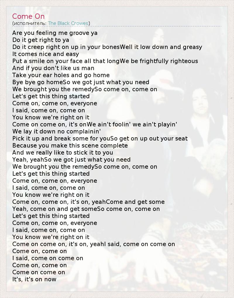 Are you feeling me groove ya Do it get right to ya Do it creep right on up in your bonesWell it low down and greasy It comes nice and easy Put a smile on your face all that longWe be frightfully righteous And if you don't like us man Take your ear holes and go home Bye bye go homeSo we got just what you need We brought you the remedySo come on, come on Let's get this thing started Come on, come on, everyone I said, come on, come on You know we're right on it Come on come on, it's onWe ain't foolin' we ain't playin' We lay it down no complainin' Pick it up and break some for youSo get on up out your seat Because you make this scene complete And we really like to stick it to you Yeah, yeahSo we got just what you need We brought you the remedySo come on, come on Let's get this thing started Come on, come on, everyone I said, come on, come on You know we're right on it Come on, come on, it's on, yeahCome and get some Yeah, come on and get someSo come on, come on Let's get this thing started Come on, come on, everyone I said, come on, come on You know we're right on it Come on come on, it's on, yeahI said, come on come on Come on, come on I said, come on come on Come on, come on Come on come on It's, it's on now
