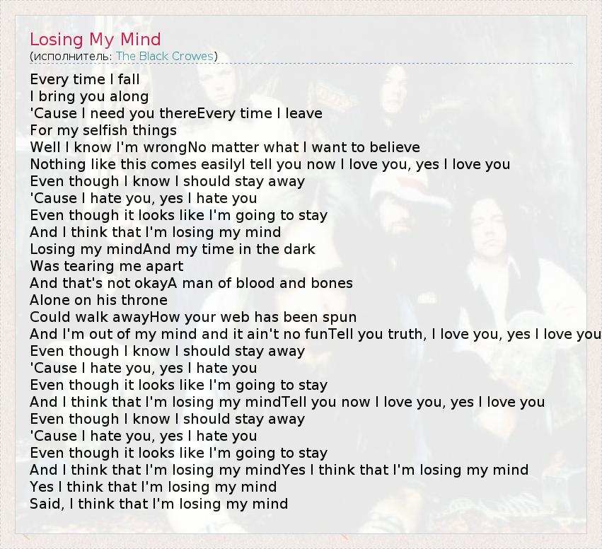 Every time I fall I bring you along 'Cause I need you thereEvery time I leave For my selfish things Well I know I'm wrongNo matter what I want to believe Nothing like this comes easilyI tell you now I love you, yes I love you Even though I know I should stay away 'Cause I hate you, yes I hate you Even though it looks like I'm going to stay And I think that I'm losing my mind Losing my mindAnd my time in the dark Was tearing me apart And that's not okayA man of blood and bones Alone on his throne Could walk awayHow your web has been spun And I'm out of my mind and it ain't no funTell you truth, I love you, yes I love you Even though I know I should stay away 'Cause I hate you, yes I hate you Even though it looks like I'm going to stay And I think that I'm losing my mindTell you now I love you, yes I love you Even though I know I should stay away 'Cause I hate you, yes I hate you Even though it looks like I'm going to stay And I think that I'm losing my mindYes I think that I'm losing my mind Yes I think that I'm losing my mind Said, I think that I'm losing my mind