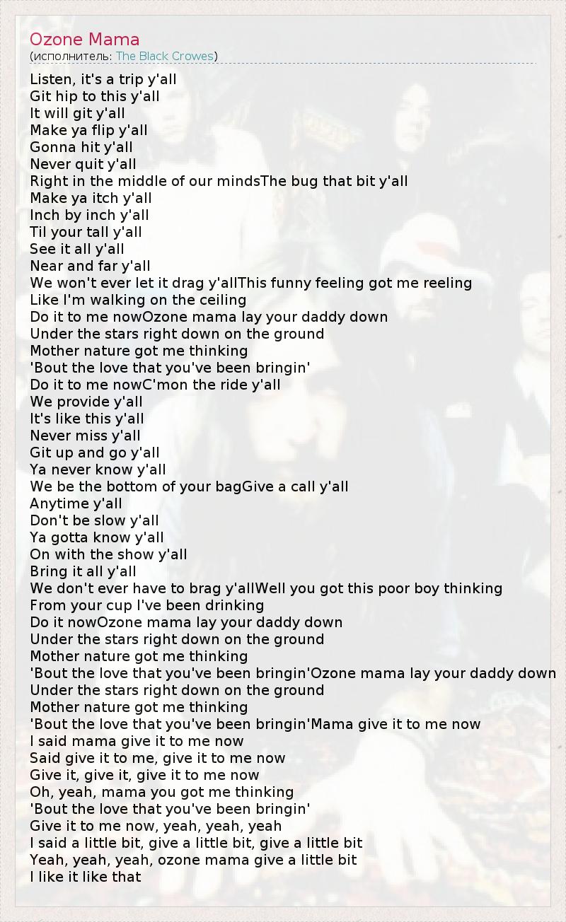 Listen, it's a trip y'all Git hip to this y'all It will git y'all Make ya flip y'all Gonna hit y'all Never quit y'all Right in the middle of our mindsThe bug that bit y'all Make ya itch y'all Inch by inch y'all Til your tall y'all See it all y'all Near and far y'all We won't ever let it drag y'allThis funny feeling got me reeling Like I'm walking on the ceiling Do it to me nowOzone mama lay your daddy down Under the stars right down on the ground Mother nature got me thinking 'Bout the love that you've been bringin' Do it to me nowC'mon the ride y'all We provide y'all It's like this y'all Never miss y'all Git up and go y'all Ya never know y'all We be the bottom of your bagGive a call y'all Anytime y'all Don't be slow y'all Ya gotta know y'all On with the show y'all Bring it all y'all We don't ever have to brag y'allWell you got this poor boy thinking From your cup I've been drinking Do it nowOzone mama lay your daddy down Under the stars right down on the ground Mother nature got me thinking 'Bout the love that you've been bringin'Ozone mama lay your daddy down Under the stars right down on the ground Mother nature got me thinking 'Bout the love that you've been bringin'Mama give it to me now I said mama give it to me now Said give it to me, give it to me now Give it, give it, give it to me now Oh, yeah, mama you got me thinking 'Bout the love that you've been bringin' Give it to me now, yeah, yeah, yeah I said a little bit, give a little bit, give a little bit Yeah, yeah, yeah, ozone mama give a little bit I like it like that
