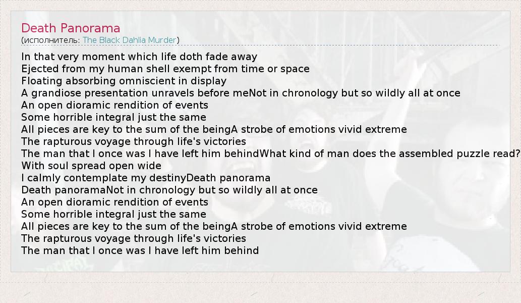 Это интересно:The Black Dahlia Murder — melodic death metal\deathcore группа, образовавшаяся в 2000 году в городе Waterford, штат Мичиган (30 минут к северу от Детройта), и за время своего существования стала одним из лидеров детройтской металлической сцены. Название группы основано на по сей день не раскрытом убийстве молодой девушки Элизабет Шорт, также печально известной как Чёрный Георгин (англ. Elisabeth Short a.k.a. The Black Dahlia;... продолжение