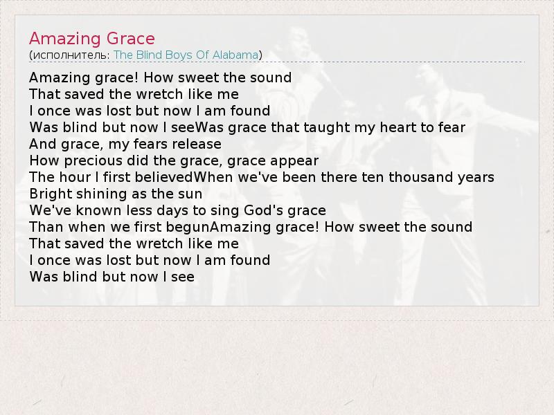 Amazing grace! How sweet the sound That saved the wretch like me I once was lost but now I am found Was blind but now I seeWas grace that taught my heart to fear And grace, my fears release How precious did the grace, grace appear The hour I first believedWhen we've been there ten thousand years Bright shining as the sun We've known less days to sing God's grace Than when we first begunAmazing grace! How sweet the sound That saved the wretch like me I once was lost but now I am found Was blind but now I see