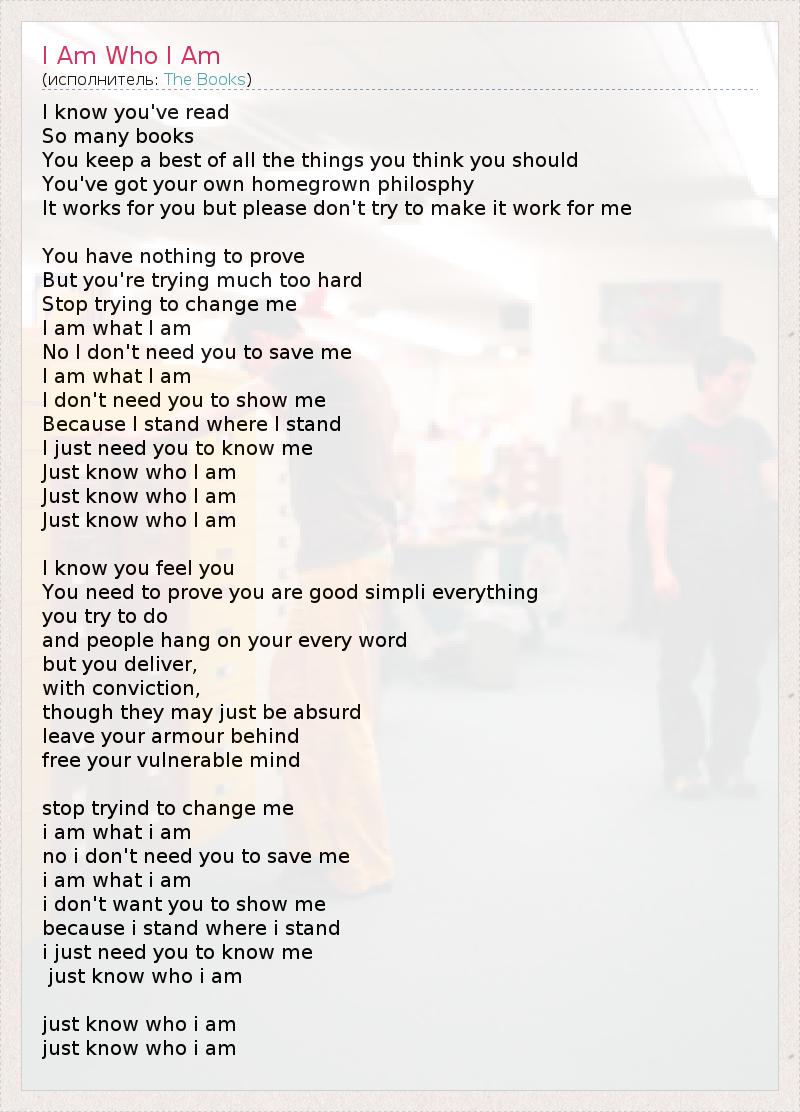 I know you've read So many books You keep a best of all the things you think you should You've got your own homegrown philosphy It works for you but please don't try to make it work for me You have nothing to prove But you're trying much too hard Stop trying to change me I am what I am No I don't need you to save me I am what I am I don't need you to show me Because I stand where I stand I just need you to know me Just know who I am Just know who I am Just know who I am I know you feel you You need to prove you are good simpli everything you try to do and people hang on your every word but you deliver, with conviction, though they may just be absurd leave your armour behind free your vulnerable mind stop tryind to change me i am what i am no i don't need you to save me i am what i am i don't want you to show me because i stand where i stand i just need you to know me just know who i am just know who i am just know who i am