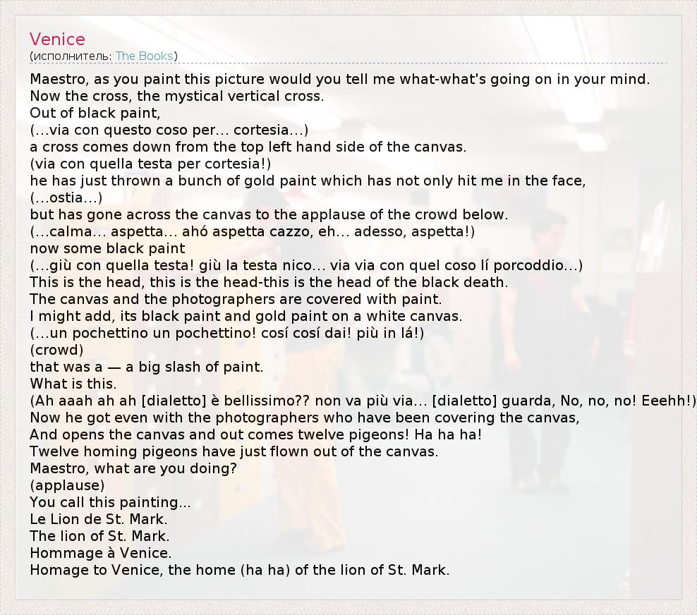 Это интересно:Группа The Books - это два человека: молодой американец Ник Заммуто и не очень молодой голландец Пол Дейонг. Пол живёт в Нью-Йорке и Роттердаме, Ник жил в Нью-Йорке, но вот уже как пару лет уехал в непроходимую глушь и тишь в штате Массачусетс, где ведёт жизнь отшельника, не показывающегося людям на глаза.Ник Заммуто – странный человек, ушедший в себя. Несколько лет назад он вроде бы был нью-йоркским... продолжение