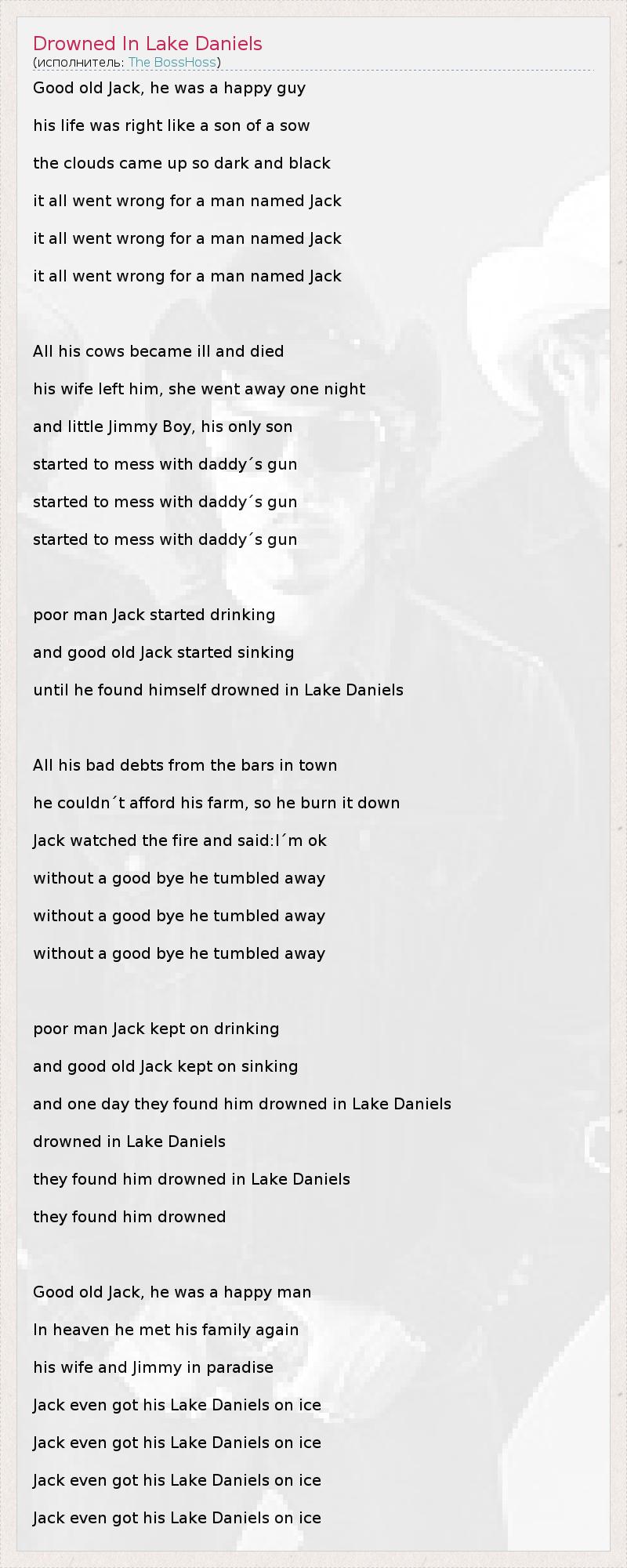 Good old Jack, he was a happy guy his life was right like a son of a sow the clouds came up so dark and black it all went wrong for a man named Jack it all went wrong for a man named Jack it all went wrong for a man named Jack All his cows became ill and died his wife left him, she went away one night and little Jimmy Boy, his only son started to mess with daddy´s gun started to mess with daddy´s gun started to mess with daddy´s gun poor man Jack started drinking and good old Jack started sinking until he found himself drowned in Lake Daniels All his bad debts from the bars in town he couldn´t afford his farm, so he burn it down Jack watched the fire and said:I´m ok without a good bye he tumbled away without a good bye he tumbled away without a good bye he tumbled away poor man Jack kept on drinking and good old Jack kept on sinking and one day they found him drowned in Lake Daniels drowned in Lake Daniels they found him drowned in Lake Daniels they found him drowned Good old Jack, he was a happy man In heaven he met his family again his wife and Jimmy in paradise Jack even got his Lake Daniels on ice Jack even got his Lake Daniels on ice Jack even got his Lake Daniels on ice Jack even got his Lake Daniels on ice
