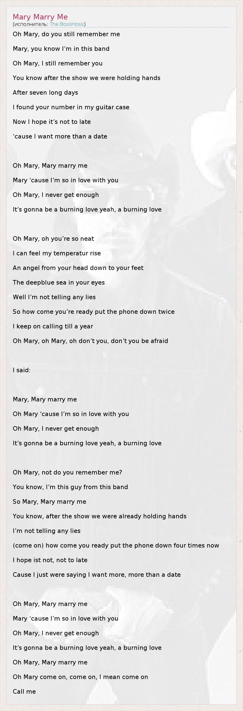 Oh Mary, do you still remember me Mary, you know I’m in this band Oh Mary, I still remember you You know after the show we were holding hands After seven long days I found your number in my guitar case Now I hope it’s not to late ‘cause I want more than a date Oh Mary, Mary marry me Mary ‘cause I’m so in love with you Oh Mary, I never get enough It’s gonna be a burning love yeah, a burning love Oh Mary, oh you’re so neat I can feel my temperatur rise An angel from your head down to your feet The deepblue sea in your eyes Well I’m not telling any lies So how come you’re ready put the phone down twice I keep on calling till a year Oh Mary, oh Mary, oh don’t you, don’t you be afraid I said: Mary, Mary marry me Oh Mary ‘cause I’m so in love with you Oh Mary, I never get enough It’s gonna be a burning love yeah, a burning love Oh Mary, not do you remember me? You know, I’m this guy from this band So Mary, Mary marry me You know, after the show we were already holding hands I’m not telling any lies (come on) how come you ready put the phone down four times now I hope ist not, not to late Cause I just were saying I want more, more than a date Oh Mary, Mary marry me Mary ‘cause I’m so in love with you Oh Mary, I never get enough It’s gonna be a burning love yeah, a burning love Oh Mary, Mary marry me Oh Mary come on, come on, I mean come on Call me