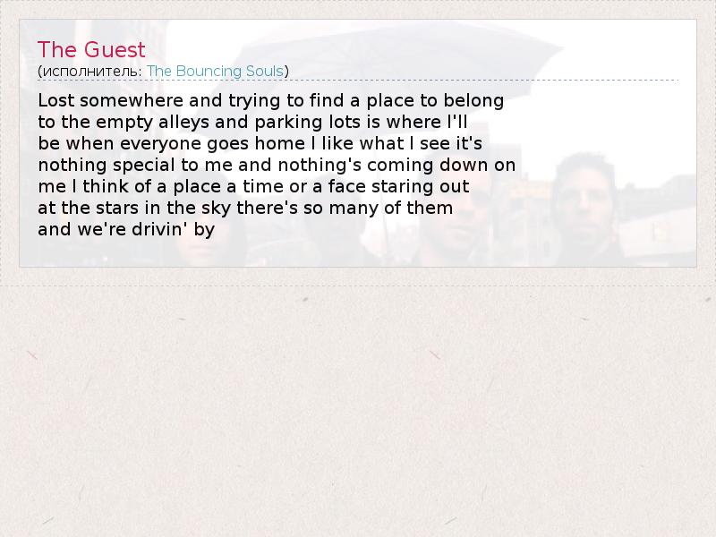 Это интересно:The Bouncing Souls - панк-группа из США (Нью Брансвик, штат Нью-Джерси), основана в 1987-м году.Название группы (примерный перевод - "Пружинящие души", "воздушные души") заимствовано из рекламы популярной в панк-культуре обуви Доктор Мартинс (Dr. Martens), в описании которой используется словосочетание "with Bouncing Soles" (подошвы с воздушной прослойкой). В названии группы использована игра слов... продолжение