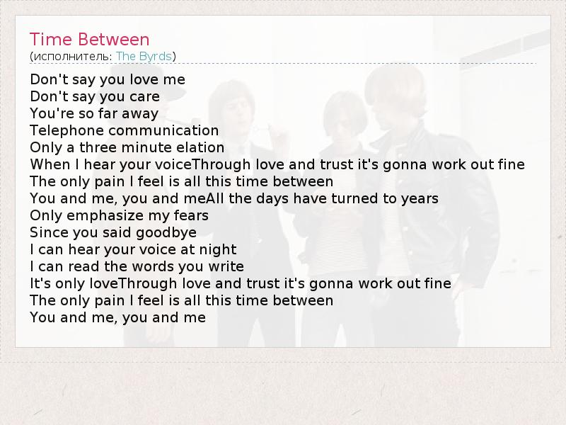 Don't say you love me Don't say you care You're so far away Telephone communication Only a three minute elation When I hear your voiceThrough love and trust it's gonna work out fine The only pain I feel is all this time between You and me, you and meAll the days have turned to years Only emphasize my fears Since you said goodbye I can hear your voice at night I can read the words you write It's only loveThrough love and trust it's gonna work out fine The only pain I feel is all this time between You and me, you and me