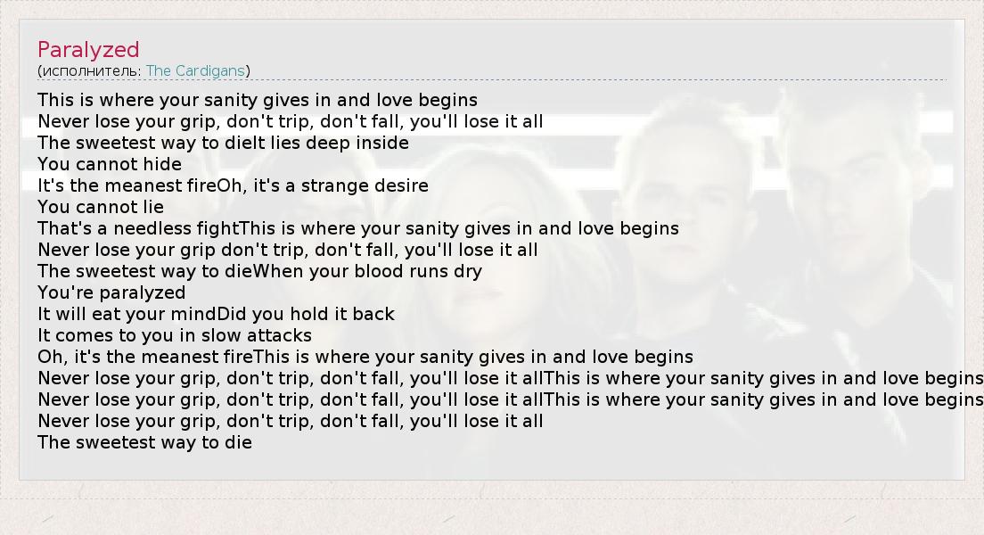 This is where your sanity gives in and love begins Never lose your grip, don't trip, don't fall, you'll lose it all The sweetest way to dieIt lies deep inside You cannot hide It's the meanest fireOh, it's a strange desire You cannot lie That's a needless fightThis is where your sanity gives in and love begins Never lose your grip don't trip, don't fall, you'll lose it all The sweetest way to dieWhen your blood runs dry You're paralyzed It will eat your mindDid you hold it back It comes to you in slow attacks Oh, it's the meanest fireThis is where your sanity gives in and love begins Never lose your grip, don't trip, don't fall, you'll lose it allThis is where your sanity gives in and love begins Never lose your grip, don't trip, don't fall, you'll lose it allThis is where your sanity gives in and love begins Never lose your grip, don't trip, don't fall, you'll lose it all The sweetest way to die
