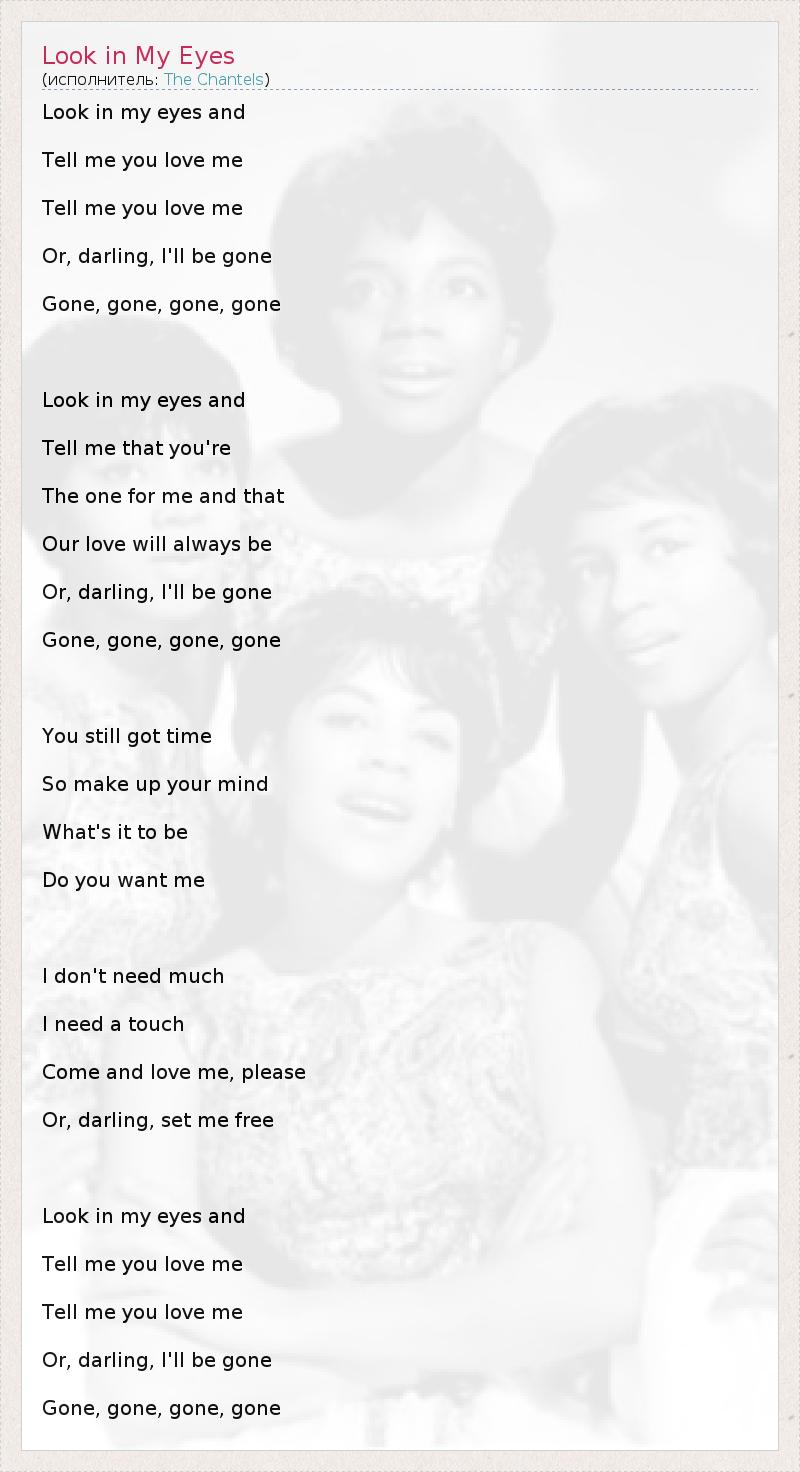 Look in my eyes and Tell me you love me Tell me you love me Or, darling, I'll be gone Gone, gone, gone, gone Look in my eyes and Tell me that you're The one for me and that Our love will always be Or, darling, I'll be gone Gone, gone, gone, gone You still got time So make up your mind What's it to be Do you want me I don't need much I need a touch Come and love me, please Or, darling, set me free Look in my eyes and Tell me you love me Tell me you love me Or, darling, I'll be gone Gone, gone, gone, gone