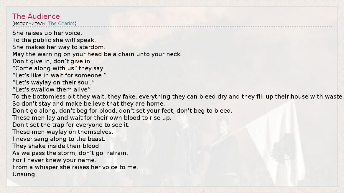Это интересно:Группа The Chariot появилась после того, как Джош Скожин в 2002 году покинул состав Norma Jean в пик успеха команды, чем смутил многих фэнов. Джош был известен своими крайне эмоциональными живыми выступлениями, поскольку во время исполнения песен он мог ползать по полу или скакать как бесноватый из стороны в сторону. О своем существовании группа заявила в 2002 году на фесте Furnace.... продолжение